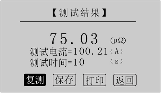 讀取測(cè)試結(jié)果,正在測(cè)試時(shí),系統(tǒng)顯示“停止”,“返回”項(xiàng)。點(diǎn)擊“停止”,系統(tǒng)停止計(jì)時(shí),電流停止輸出。點(diǎn)擊“返回”,系統(tǒng)停止計(jì)時(shí),電流停止輸出并返回上一界面。注意:開(kāi)始測(cè)試的前幾秒,由于電流沖擊和電容充電,測(cè)試結(jié)果不穩(wěn)定,5s后測(cè)試結(jié)果穩(wěn)定,用戶即可記錄數(shù)據(jù)。