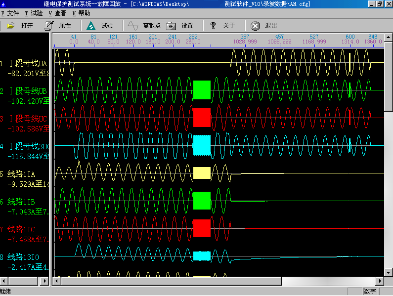 試驗前首先打開某一個記錄文件。記錄文件可以放在任何子目錄中,在“打開文件”對話框中查找,找到所在子目錄后程序會自動將所有后綴為.CFG的文件名列出。選定某一文件后程序自動將該名字的.CFG和.DAT文件調(diào)入,并將所有電壓電流波形及其通道名稱等顯示在屏幕上。另外還可以通過工具欄的按鈕查看文件屬性、波形離散采樣點等。