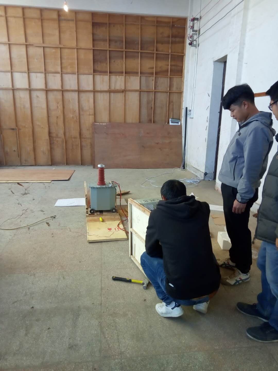 陳工很快抵達現場,與客戶進行面對面的交流,了解客戶的需求和想法。然后開始講解設備,并認真講解怎樣安全操作設備。確保客戶明白了安全操作以后,陳工帶領客戶一起做試驗——YD-J-30kVA/50kV工頻交流耐壓試驗裝置的速度測量,行程測量,電流測量等一系列試驗。我公司的設備比較先進,采用單框芯式鐵芯結構。初級繞組饒在鐵芯上,高壓繞組在外,這種同軸布置減少了漏磁通,因而增大了繞組間的耦合。產品的外殼制成與器芯配合較佳的八角形結構,整體外形顯得美觀大方。我公司產品具有體積小、重量輕、結構緊湊、功能齊全、通用性強和使用方便等特點。特別適用于電力系統、工礦企業、科研部門等對各種高壓電氣設備、電器元件、絕緣材料進行工頻或直流高壓下的絕緣強度試驗。