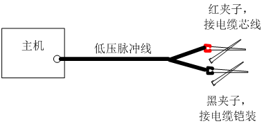 低壓脈沖測試法只需要將低壓脈沖線有插頭的一側(cè)插入主機(jī)“信號”接口。測試線的紅色夾子夾在A 、B、 C 三相的某一相上, 黑色夾子夾在電纜的“鎧裝”上面。