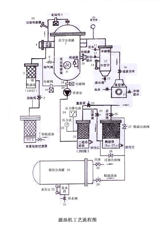 1、首先將所有閥門關(guān)閉,然后打開總電源,啟動真空泵(17),打開(16),當(dāng)真空泵達(dá)到-0.09Mpa后,停(17),(5) ,(18), 電磁閥(19)自動打開,此時打開初始進(jìn)油閥(1),進(jìn)油閥(2)過閥(22)過濾出油閥,精濾進(jìn)油閥(29)出油(30),這時才能啟動排油泵20)輸去油液進(jìn)入聚結(jié)分離階段。