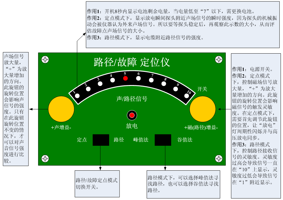 步驟2 將“定點/路徑”模式開關切換到“路徑”模式然后打開路徑/故障定位儀的電源開關,開機8秒內顯示電池電量(電量低于“7”時需更換電池!)。