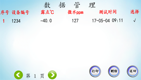 點擊“返回”,儀器返回到“功能選擇”。在“功能選擇”界面選擇“數據管理”,進入“數據查看”界面,如下圖所示。可以在此界面查看以前保存的數據。